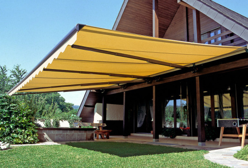 seitliche Aufnahme von herausgelassenen gelben Sonnenstoren