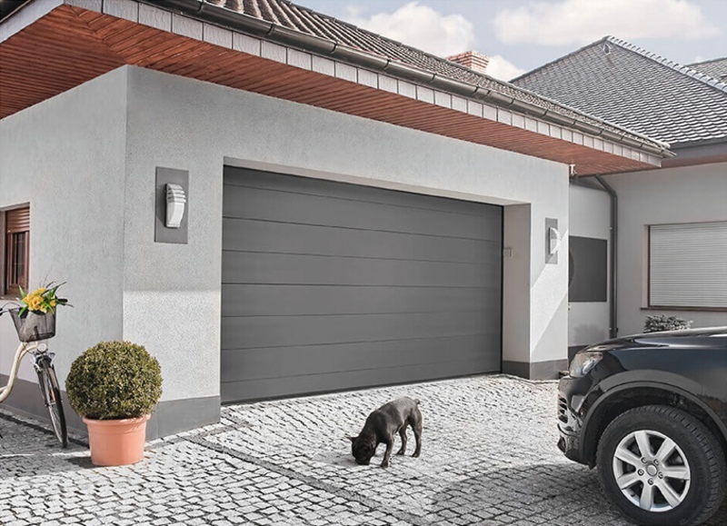 Haus mit einem anthraziten Garagentor. Davor läuft ein kleiner Hund umher.
